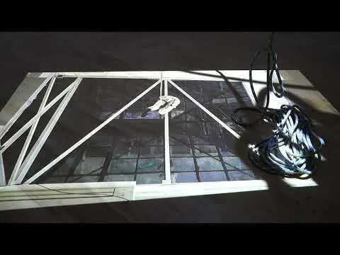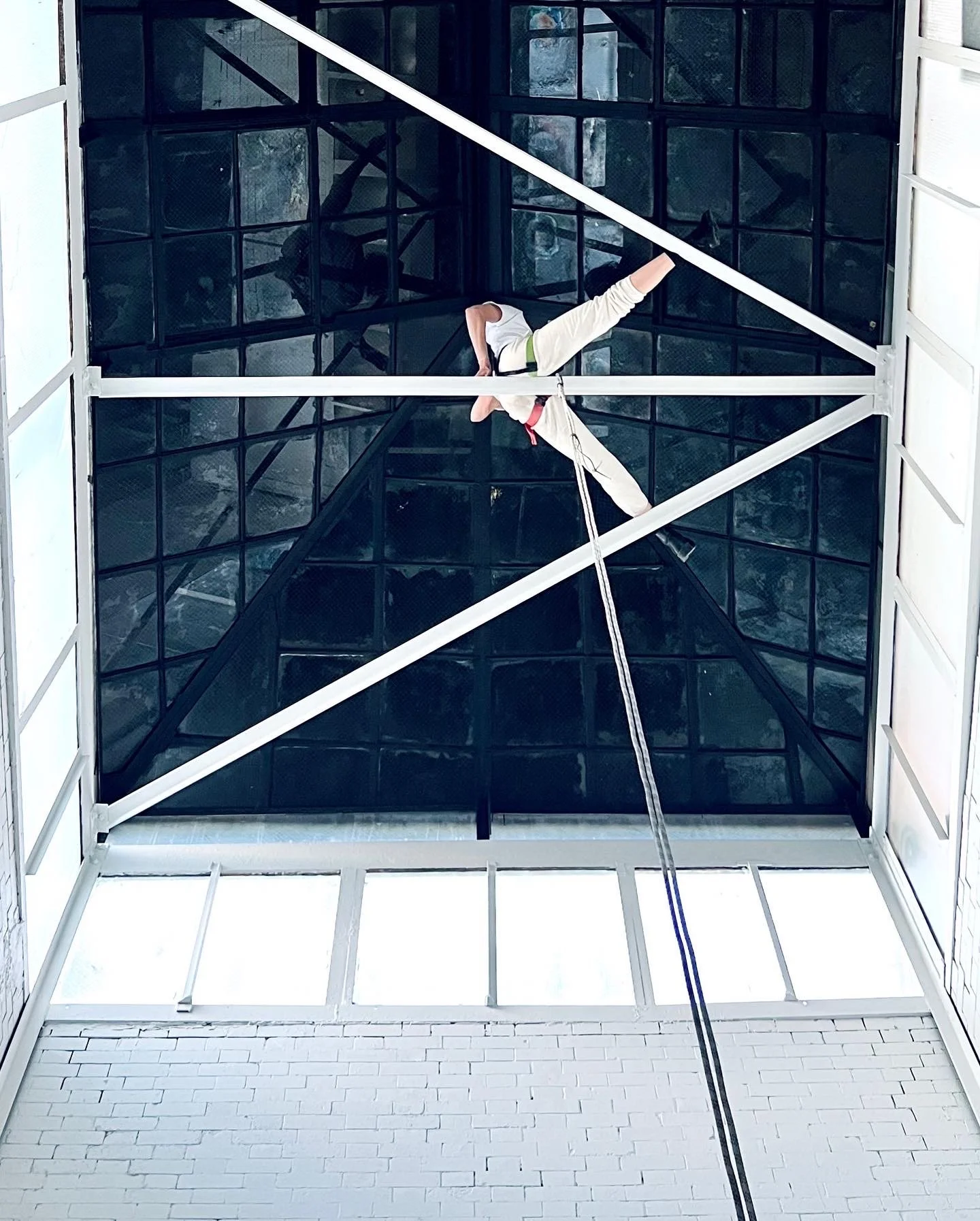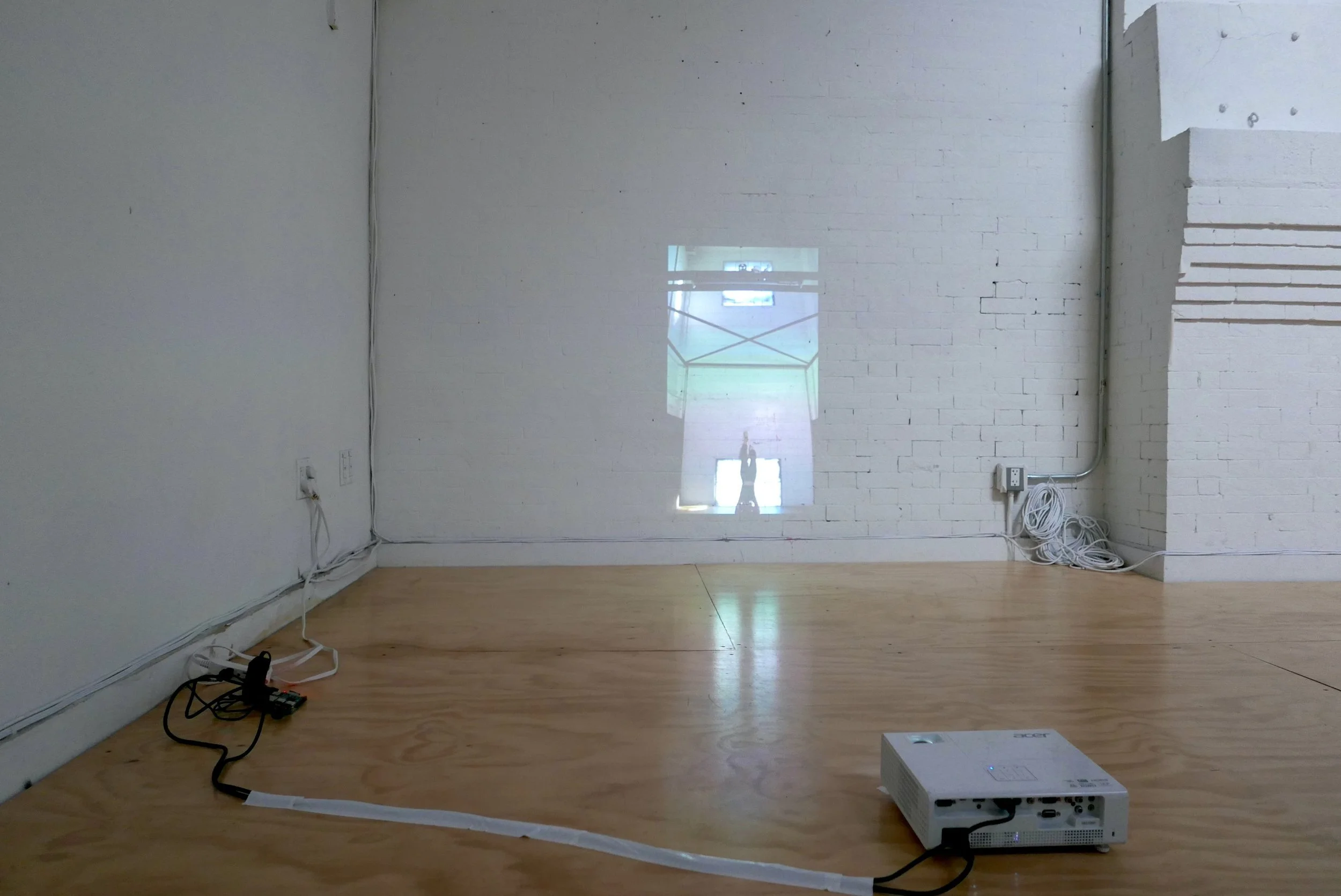 In the overpass, the undergoer, tilted water, Schwenk’s performance engages with the gallery’s large concave skylight. Using a rope attached to one of the skylight’s three supportive diagonal braces, Schwenk makes the thirty foot ascent into the skylight, operating her body as a vector to adjust and adapt to the space, working with and against the angularity of it’s shapes, before climbing down again. During the performance, Schwenk’s actions are documented with a camera pointing vertically up at the skylight. On her descent, she then attaches a projector to the rope that she used to climb up on and projects the video of the performance onto the floor beneath the skylight, creating a circular link between the performance and its projected documentation. With the image of the recent performance projected onto the floor, the ground and sky become mirrored images of each othe. Of what is, once was, and what could be.